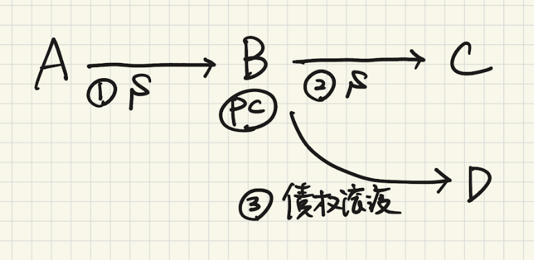 そして、動産の場合の第三者対抗要件は「引渡し」であり、譲渡担保の場合は占有改定による引渡しであっても第三者対抗要件は具備していると考えられる。ということは、動産譲渡担保権に基づく物上代位権を債権の譲受人に行使することは認められるわけだが、債権の譲受人にとっては結構酷なのである。確かに動産譲渡担保権者は占有改定による引渡しにより第三者対抗要件を具備しており、物上代位を行使できるのだが、債権の譲受人(下図のF)にとっては、譲り受けた債権が動産譲渡担保権が付随している債権であると認識する術がないのである。第三者対抗要件は具備しているけど、その第三者(下図のF)は物上代位される可能性を予見する余地がないという事態に陥るのである。例えば、以下の事例を考える。