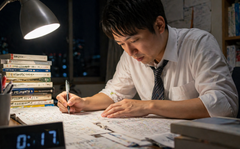 会社と家を往復して、仕事が終われば民法の論文を書いて、休日は図書館かファミレスに出かけてひたすら民法の論文を書いているのである。事件は起きない。これが受験生の現実だ。結局のところ、常に頭のどこかに弁理士試験が見え隠れしていて、ずーっと頭の上は曇天である。